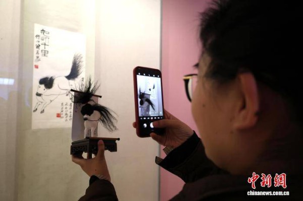 2月13日,山东济南,“马彪彪”雕塑亮相展览现场。当天,由北京画院珍藏的齐白石《十二属图》亮相山东美术馆“学我者生——齐白石与山东弟子”特展。展览现场,“网红”马彪彪与原作《如此千里》同框展出。赵晓 摄