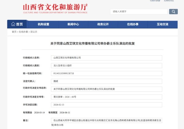 2月13日,山西省文旅厅批复多场演出,包括音潮声浪LIVE、爵士乐队、ELLA陈嘉桦太原演唱会及舞动精灵出道25周年太原演唱会。