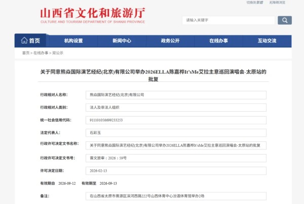 关于同意熊焱国际演艺经纪(北京)有限公司举办2026ELLA陈嘉桦It’sMe艾拉主意巡回演唱会-太原站的批复
