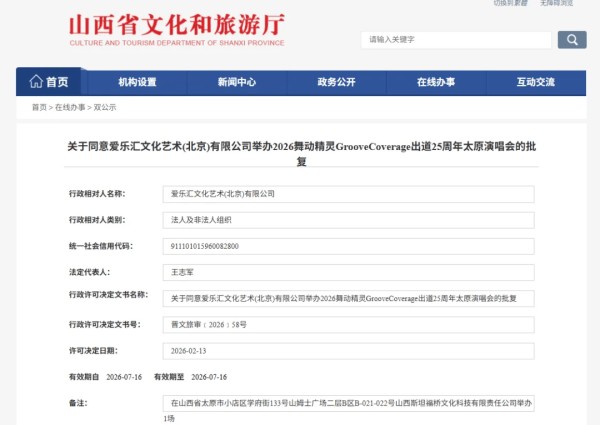 关于同意爱乐汇文化艺术(北京)有限公司举办2026舞动精灵GrooveCoverage出道25周年太原演唱会的批复
