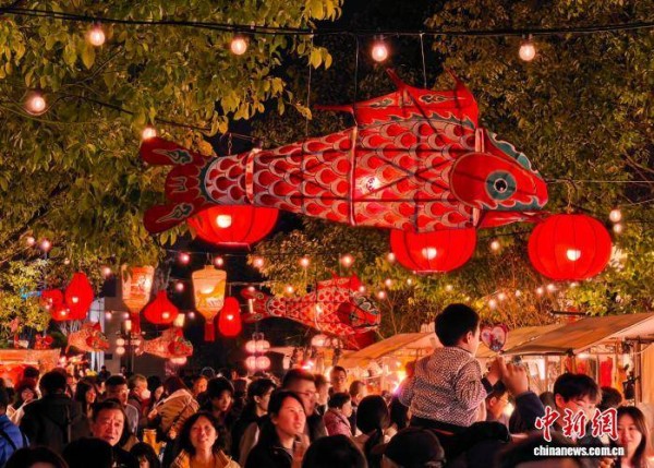2月14日,龙马庙会人气十足。当日,上海蟠龙天地新春活动将传统年俗与江南水韵完美融合。非遗灯会璀璨点亮,水上鱼灯巡游如梦似幻,龙马庙会市集热闹非凡,为申城新春增添一抹别样的江南烟火气,吸引市民游客纷纷前来感受年味。中新社记者 汤彦俊 摄