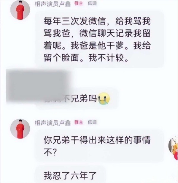 张玉浩宣布单飞,并实名举报卢鑫挪用公司资金后,卢鑫立即展开舆论反击,打出情感牌和伦理牌,在多个粉丝社群发布所谓重磅爆料,称张玉浩连续六年每逢特定日期辱骂其父三次,自己一直隐忍不发。而张玉浩的回应冷静且策略性十足——他直接公开与卢鑫父亲长达数年的微信对话截图,清晰显示他长期主动问候卢父,在春节中秋奉送厚礼,并曾在卢鑫深陷债务危机时伸出援手。这些原始记录宛如手术刀,精准剖开卢鑫构建的孝子人设,令所谓六年隐忍瞬间沦为转移焦点的公关话术。舆论风向急转,网友纷纷调侃其在导演苦情独角戏,公众形象遭受毁灭性打击。