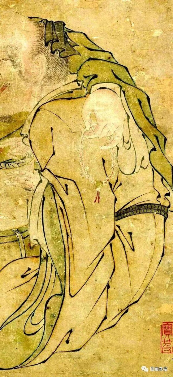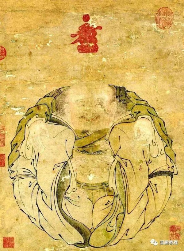 此幅粗看似一笑面弥勒盘腿而坐,体态浑圆,细看却是三人合一。左首为一着道冠的老者;右首为一戴方巾的儒士,二人各执经卷一端,团膝相接,相对微笑。第三人则手搭两人肩上,面部被遮,只露出光光的头,一手轻捻佛珠,是佛教中人。构图合三人为一体,“霭一团之和气 ”,精妙绝伦。人物刻画生动传神,衣纹细劲流畅,顿挫自如,显示出画家的匠心巧思与高超技艺。