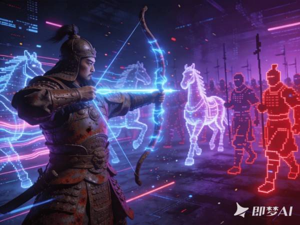 西汉飞将军李广突入AI数字世界,铁甲与流动的数据星河碰撞,只见他挽弓搭箭,一箭射穿由算法生成的千军万马,“虚虚实实”之间,箭锋所及之处,是幻象的溃散与数据的重组。他终于在这片无垠的虚幻里,找到了那一道由人的意志贯穿、算法无法预测与复制的轨迹。
