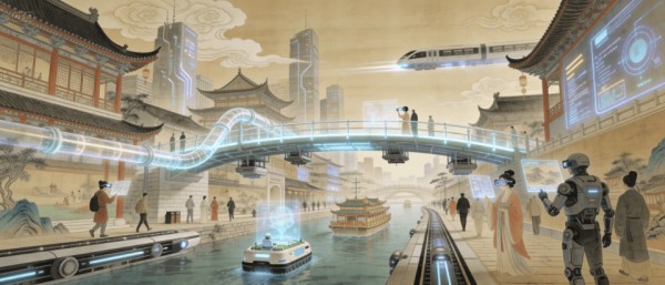 这是一幅AI版清明上河图。天空被染上数字化的暮色,空中飞车如流星般穿梭于传统勾栏瓦肆之间,留下淡淡的光轨尾迹;河边与青石板街交织处,无数半透明的数据管道蜿蜒蔓延,算力在其中如电流般闪烁流动,无孔不入地渗透进每个角落;当垆少女伫立在河边,手指轻盈地比画着全息导航菜单,彩色光影在她指尖跳跃,机器人们从她身边擦肩而过。