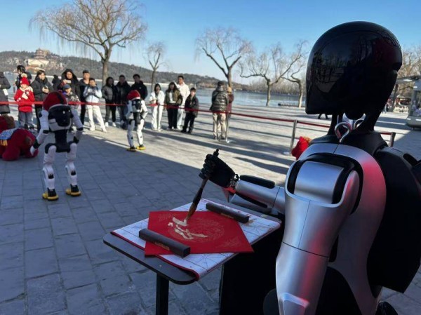 最引人注目的,当属书写福字环节。一台1.7米高的机器人缓步登场,这台机器人稳稳握笔开始书写,一个喜庆的“福”字跃然纸上。游客们纷纷鼓起掌。一位来自广东的游客笑着说:“头一回见机器人写福字,太有意思了!”