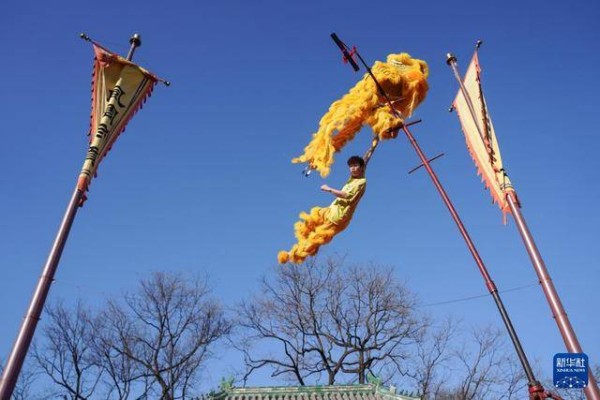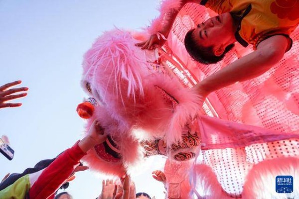 2月17日拍摄的东岳庙庙会中的狮舞演出。