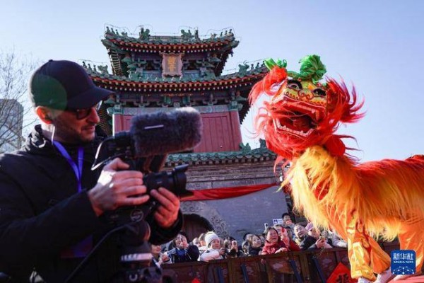 2月17日,东岳庙庙会中的狮舞演出吸引了外国摄影师拍摄。