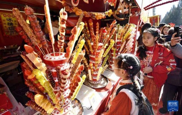 2月17日,市民在北京地坛春节文化庙会上买糖葫芦。