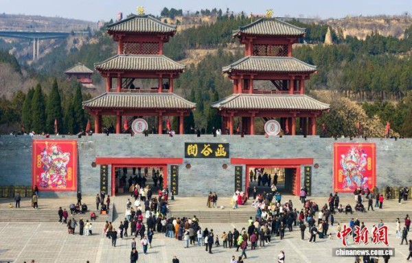 2月17日,河南省三门峡市灵宝函谷关历史文化旅游区新春大庙会吸引众多游客,舞狮、杂技、互动游戏……丰富多彩的活动营造出浓浓的年味。图为庙会上游客众多。孙猛 摄
