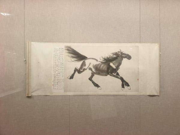 宜兴市美术馆副馆长杨素璞介绍,馆中的“镇馆之宝”是三幅“马”的真迹,分别代表徐悲鸿艺术生涯中早中晚期三种不同的风格。第一幅《横幅奔马》是早期作品,“马”的姿态轻盈愉悦、朝气蓬勃。第二幅《竖幅奔马》,是徐悲鸿在1937年左右所作,此时正值抗战最为艰难的时刻,也是徐悲鸿创作力鼎盛时期。画面上,一匹铮铮傲骨的“战马”跃然纸上,虽然体格精瘦,却精神勃发,仿佛随时要奔赴战场。第三幅《献志愿军奔马》创作于1953年,上书“献给敬爱的志愿军五十二部六四〇部队二中队的功臣……”,“马”的笔墨纯熟、神韵聚拢、步履刚健,展现出“雄赳赳气昂昂”的必胜信心。