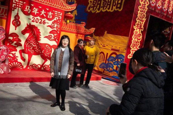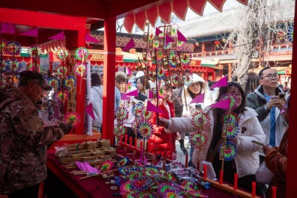 2月20日,市民游客在北京东岳庙庙会上游玩。2月17日-21日(初一至初五)期间,东岳庙通过潮汕英歌舞、舞狮、马年特色展陈、非遗市集等,打造“最正宗的年味”。