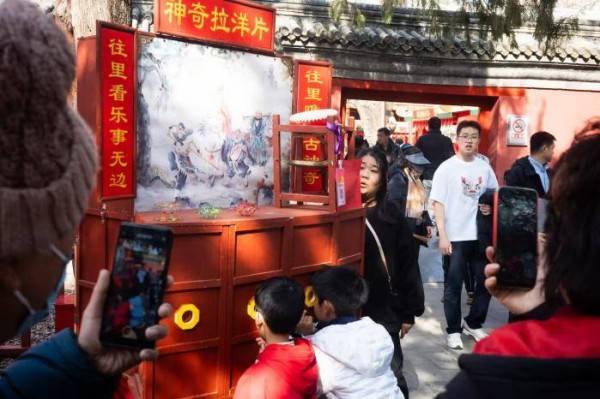 东岳庙庙会入口处,游人在“马年大吉”墙前打卡拍照。