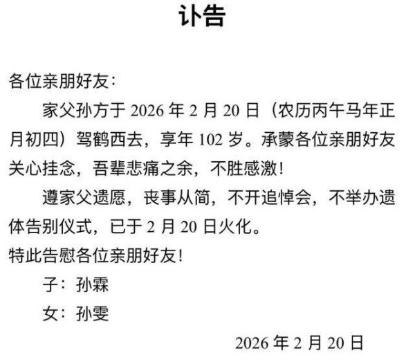报社首任社长孙方先生于2026年2月20日(农历丙午马年正月初四)驾鹤西去,享年102岁。