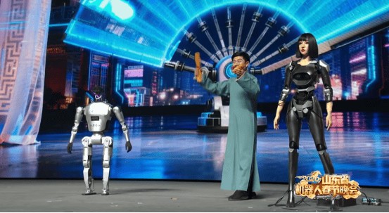 为让文化赋能更具象、更鲜活,晚会深挖山东文化IP,以科技为桥梁实现传统艺术的现代表达,让非遗技艺在创新中传承。作为国家级非物质文化遗产,山东琴书以琴为骨、乡音为魂,承载着齐鲁儿女的深厚情感与集体记忆。《老师傅“遇”AI》节目中,老艺人同台献艺,指尖捻弦、乡音悠扬,身旁的AI机器人则以精准算法接腔对唱,为非遗传承注入新潮活力;情景武术《传承·共生》里,人形机器人与武校学生相向而立,抱拳行礼、切磋招式,将水泊梁山武术的刚劲豪迈与机器人的精准利落完美融合,在刚柔并济间彰显齐鲁文化中的“忠义”内核。