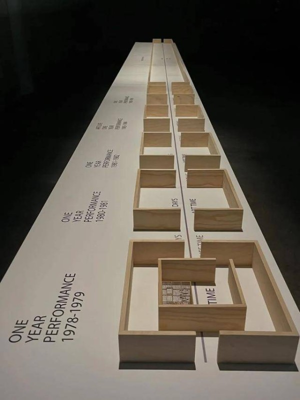 回顾展的结束部分有个依据艺术家的思路和历程,耗时多年构思的一座精美的木制建筑模型(下图),让我驻足良久。谢德庆精确地将每件以一年为期的作品化为一个方格,标示为“艺术时间”(Art Time),方格之间的空隙则象征“生活时间”(Life Time),将一生作品化为艺术的度量单位,展现艺术与生活之间融而为一,又各自为政的实践。纯粹到极致地以身体为媒介,以时间为材料,以具体的空间结构呈现他在其间所经历的时间跨度与生命历程。对着模型我感悟到:谢德庆只做自己想做的事,走只有“我”独一无二的路,他既不属于这里也不属于那里,上下左右他都不属于,他属于他,为艺术燃烧生命,属于他的生命常态。