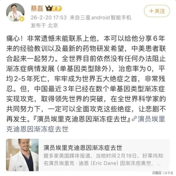 他最终在家里离世,时间是2026年2月19日,妻子和孩子都陪在他身边,他本人没有对外透露治疗的具体情况,也没有提过参与过哪些药物试验,家人只说“爱和陪伴才是最重要的”,这一点与中国患者蔡磊的做法很不一样,蔡磊建立了“渐愈”平台,用来收集数据、筛选药物,还组织病友们一起努力,2026年2月20日蔡磊发帖悼念迪恩,写道“真的很遗憾没能联系上他”,其实不是蔡磊没有尝试过,而是迪恩从未公开露面,也没有加入任何病友组织。