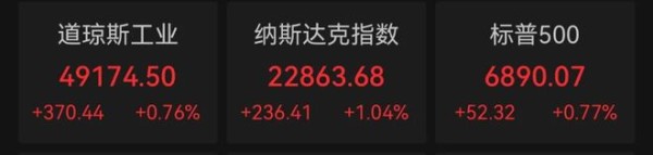 道琼斯工业指数上涨370.44点,涨幅0.76%,收于49174.50点;标普500指数上涨52.32点,涨幅0.77%,收于6890.07点;纳斯达克综合指数上涨236.41点,涨幅1.05%,收于22863.68点。