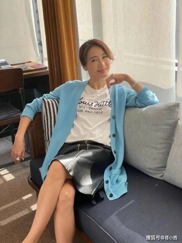 日常搭配可以借鉴她这一身针织衫叠穿,主打一个舒适减龄,浅蓝色的针织开衫,颜色清新柔和,像春日的天空,瞬间降低了年龄感,开衫的版型宽松,对身材的包容度极高,内搭一件印有字母的白色T恤,休闲又不失设计感。