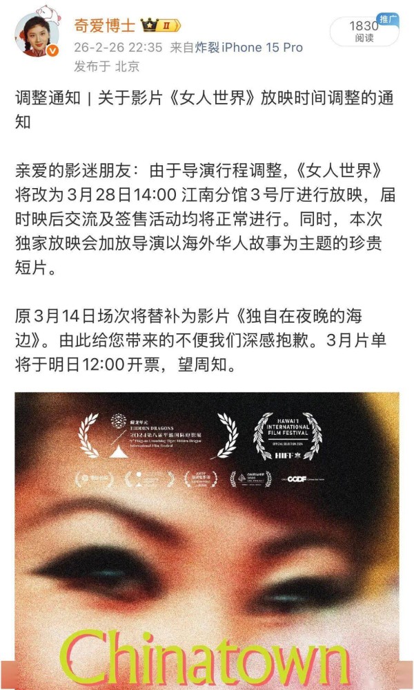 关于影片《女人世界》放映时间调整的通知