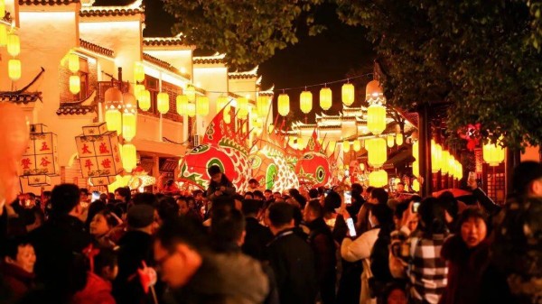 每天两场的沉浸式巡游成为最热闹的风景:在“鱼灯仙子”引领下,8米长的巨型鱼灯需要数人合力舞动,游客们手持小鱼灯紧随其后,穿行在青石板路上,再现“一夜鱼龙舞”的古街盛景。药发木偶、中幡杂技等非遗项目轮番亮相,民乐快闪的悠扬旋律萦绕古巷,三河米饺的香气与年味交织升腾。大年初一当日,古镇入园人数便超6.5万人次,省外游客占比显著提升。