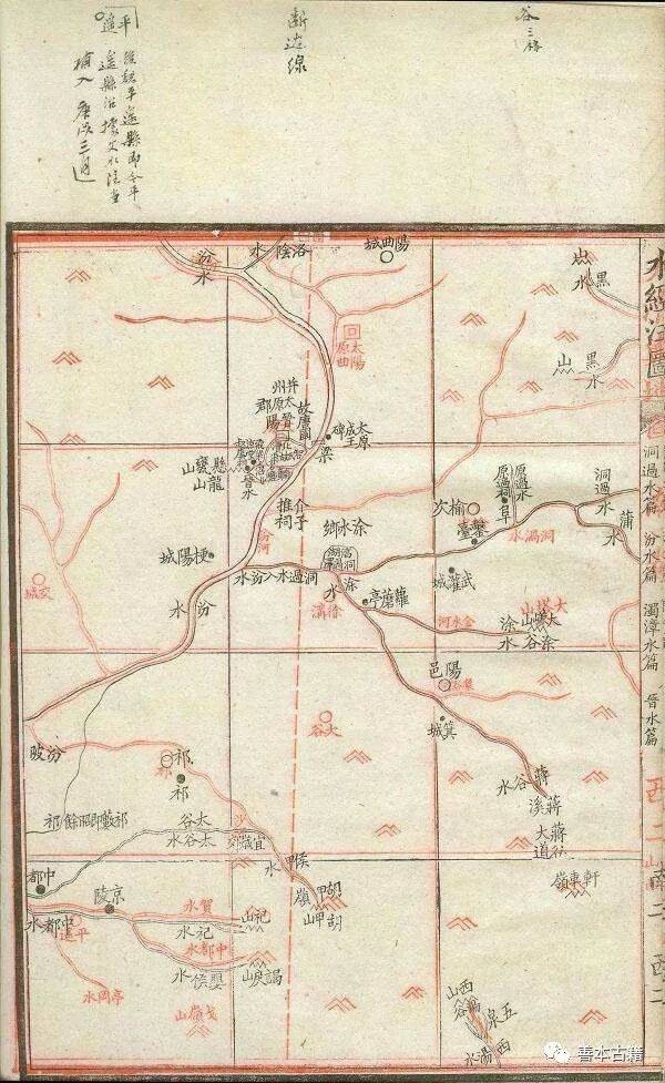 杨守敬20岁时描绘《舆地图》,后刊刻《历代舆地沿革险要图》,又和熊会贞费时3年作《水经注图》,古今对照,朱墨套印。杨守敬据郦亭自序“寻图访迹”,知其所据必有至精至详之图,今已轶。他说:“余既同熊君会贞撰《水经注疏》,复为图以经纬之,昕昕商榷,年历三周乃成。昔郦氏据图以为书,今乃据书以为图,川土流移,未必悉还旧观”,地势水道不合的“以墨线笺之”。此图从内容及形式都有可改进之处,但在清代算是最好的《水经注图》。在今天,与治水亦有通古观今的作用。