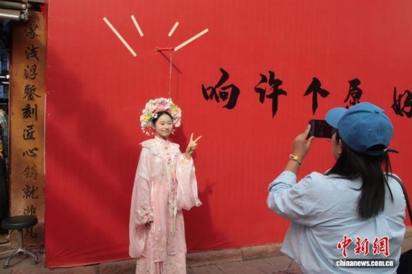 图为簪花造型的游客在摄影师的指导下拍照。陈选斌 摄
