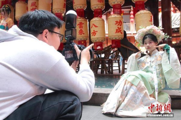 图为游客在洛带古镇拍摄簪花写真。陈选斌 摄