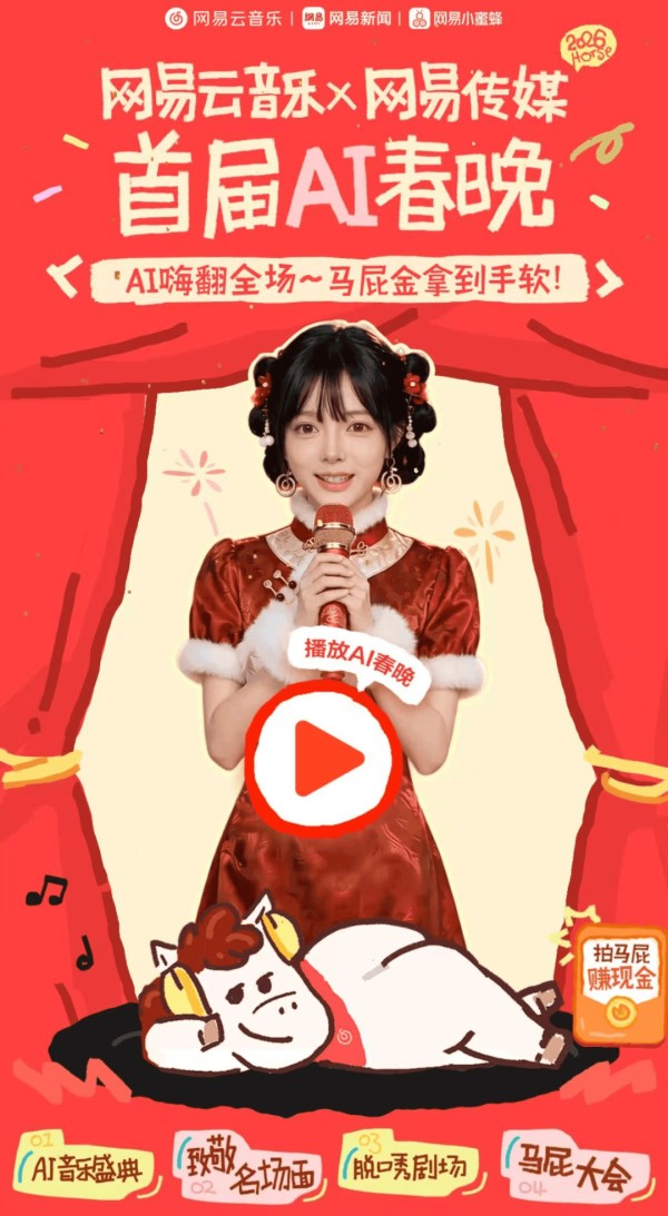 除了传统晚会与AI的深度结合之外,音乐平台也在通过AI寻找新的叙事出口。网易云音乐于春节期间举办的首届马年AI春晚,以AI音乐盛典、致敬名场面和脱口秀剧场组成。整个AI盛典主视频长达15分钟,以动画形式呈现,博物馆内的古董复活,惟妙惟肖地唱起歌来奏起乐。其中一首作品由平台孵化的AI音乐人“漫游会议室”制作,此前其发布的“唱西游”系列AI音乐,为孙悟空、猪八戒、如来等传统角色AI创作不同音乐风格的主题曲,引发大量听众互动,此次又以“白龙马”视角创作了大话西游马年新春宣传曲《皆大欢喜》。