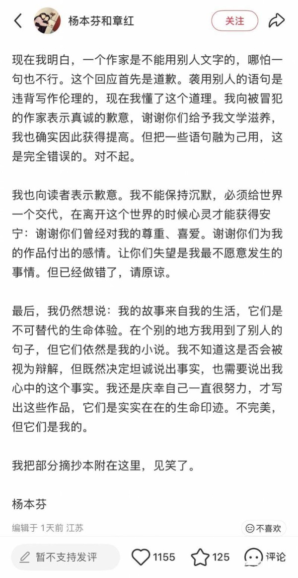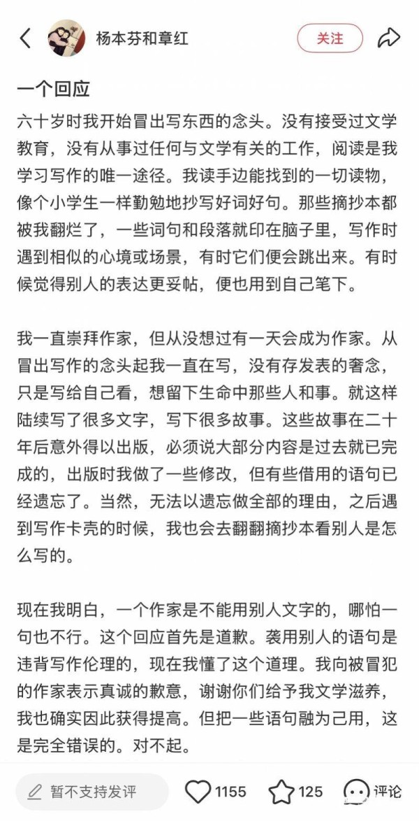 2月26日,杨本芬在社交媒体账号“杨本芬和章红”上发文回应抄袭争议。杨本芬说:“现在我明白,一个作家是不能用别人文字的,哪怕一句也不行。这个回应首先是道歉。”