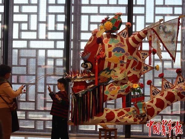 2月18日,北京,大年初二,在中国工艺美术馆(中国非物质文化遗产馆)“气象万千——中国非遗保护实践主题展”,过年气氛浓烈,奶奶正在为孙子拍照。中青报·中青网记者 余冰玥/摄