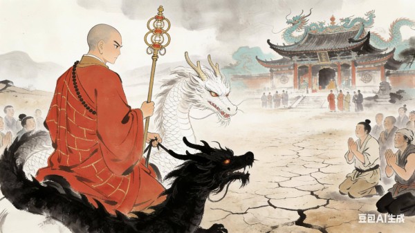 唐僧心善,见了这般景象,就停下脚步,对着龙王庙拜了三拜:“阿弥陀佛,若有神灵庇佑,望能赐雨救民,贫僧愿折损十年修行。”