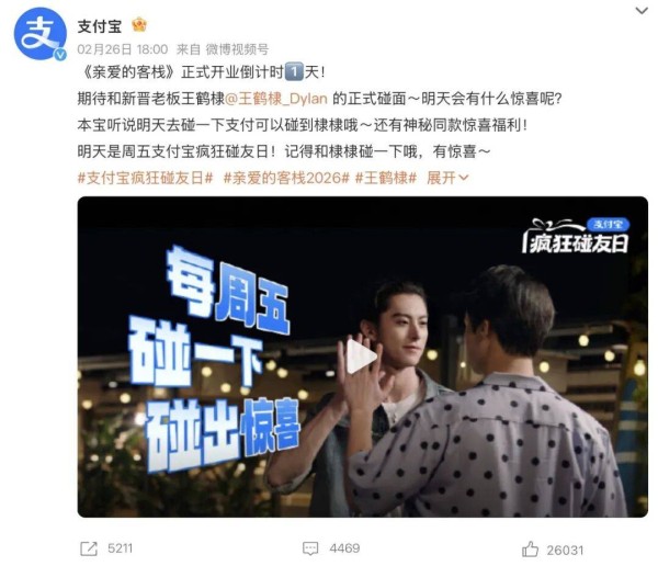 先是阿里系头牌产品支付宝独家冠名,就很活久见,反正印象里没见它冠过综艺。直到看了26日支付宝官微很给牌面的单独发博,犀牛君恍然大悟,支付宝最近力推的碰一碰支付跟客栈综艺前台场景适配度也太高了吧,“本宝听说明天去碰一下支付可以碰到棣棣哦”这广告语简直是精准打击好吗!