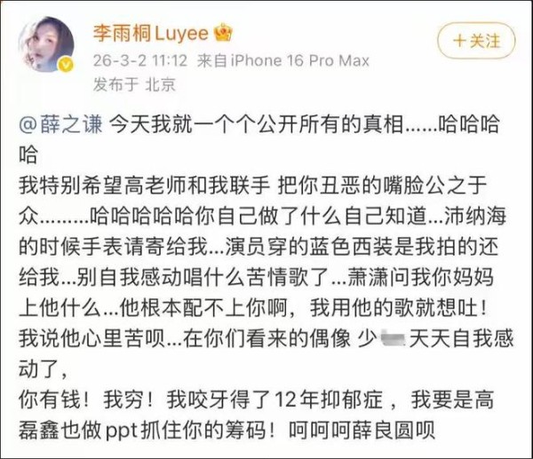 3月2日,李雨桐发文实名举报薛之谦了。她说“佛魔差一张纸,薛之谦你得罪我,下地狱去吧!还随你去天堂?”