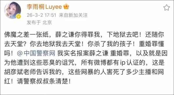 李雨桐实名举报薛之谦涉嫌重婚罪,称其还杀了自己孩子