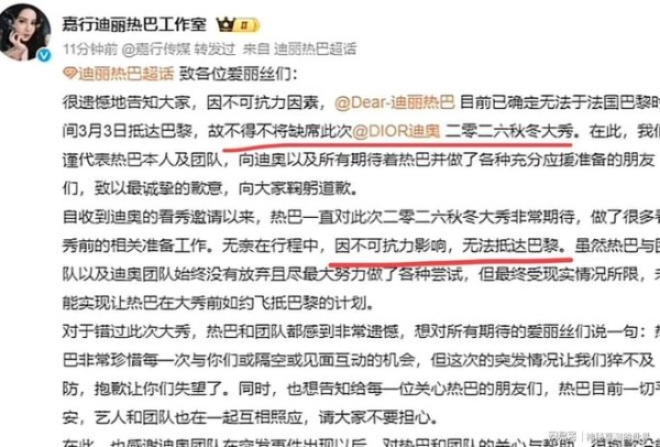 迪丽热巴已经滞留迪拜超72小时了,并不是网传的24小时,今天迪奥大秀开始,瞒不住了,不得已才出来告诉粉丝,不然还会一直瞒下去。
