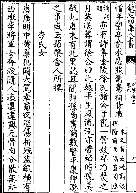 唐广明中,黄巢犯阙,大驾幸蜀,衣冠荡析,寇盗纵横。有西班李将军女,奔波随人,迤逦达兴元,骨肉分散,无所依托。适值凤翔奏将军董司马者,乃晦其门阀,以身託之。而性甚明敏,善于承奉,得至于蜀。寻访亲眷,知在行朝,始谓董生曰:“丧乱之中,女弱不能自济,幸蒙提挈,以至于此。失身之事,非不幸也。人各有偶,难为偕老,请自此辞。”董生惊愕,遂下其山矣。识者谓女子之智,亦足称也。见刘山甫《闲谈》。(寅恪案,闽从事刘山甫撰《金溪闲谈》拾贰卷,即见《北梦琐言》)。