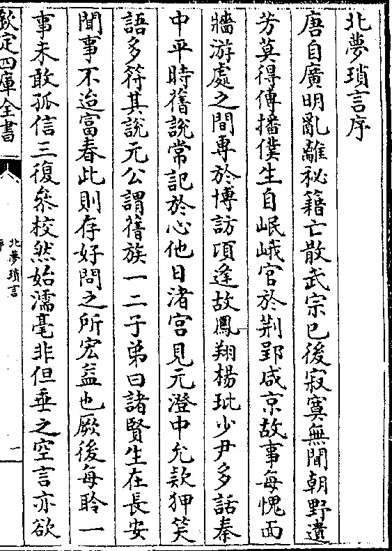 《四库全书总目》卷一百四十子部小说家类:《北梦琐言》二十卷(内府藏本)宋孙光宪撰。光宪字孟文,自号葆光子。《十国春秋》作贵平人,而自题仍称富春。考光宪自序,言生自岷峨,则当为蜀人,其曰富春,盖举郡望也。仕唐为陵州判官,旋依荆南高季兴为从事,后劝高继冲以三州归宋,太祖嘉之,授黄州刺史以终。《五代史·荆南世家》载之甚明。旧以为五代人者,误矣。所著有《荆台集》、《橘斋集》、《笔佣集》、《巩湖集翫》、《蚕书》、《续通历》等书,自宋代已散佚,惟是书独传於后。其曰《北梦琐言》者,以《左传》称田於江南之梦,而荆州在江北,故以命名,盖仕高氏时作也。所载皆唐及五代士大夫逸事,每条多载某人所说,以示有徵,盖用《杜阳杂编》之例。其记载颇猥杂,叙次亦颇冗沓,而遗文琐语,往往可资考证。故宋李昉等编《太平广记》,多采其文。晁公武《读书志》载光宪《续通历》十卷,辑唐及五代事,以续马总之书,参以黄巢、李茂贞、刘守光、按巴坚【按“按巴坚”原作“阿保机”,今改正。】、吴、唐、闽、广、吴越、两蜀事迹,太祖以所记多不实,诏毁其书。而此书未尝议及,则语不甚诬可知矣。世所行者凡二本,一为明商濬《稗海》所刻,脱误殆不可读。近时扬州新刻,乃元华亭孙道明所藏,犹宋时陕西刊版,差完整有绪。故今以扬州本著录,不用商氏本云。