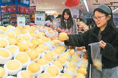 惊蛰临近,消费者在山东省东营市文汇街道一商超购买雪梨。