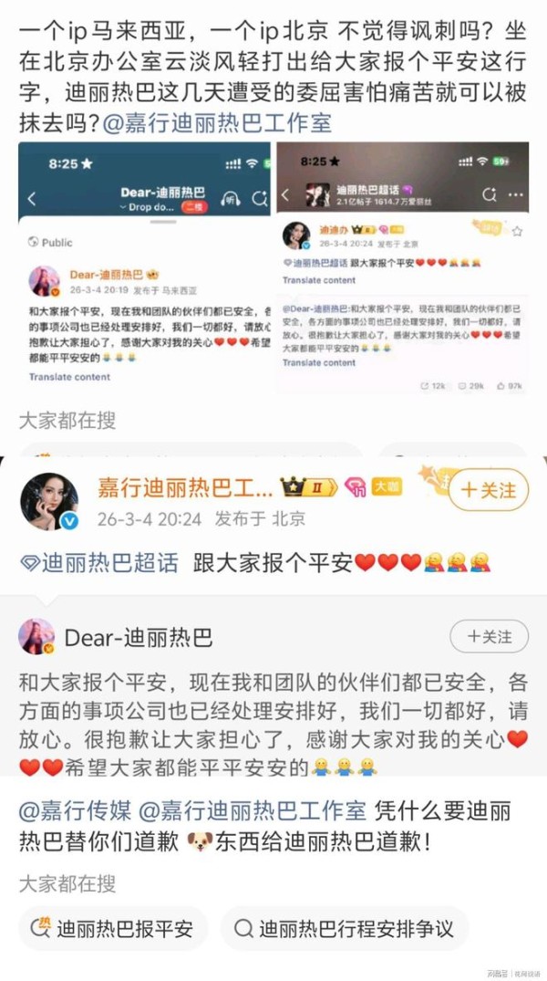 迪丽热巴发文报平安,IP定位马来西亚,工作室失职引争议