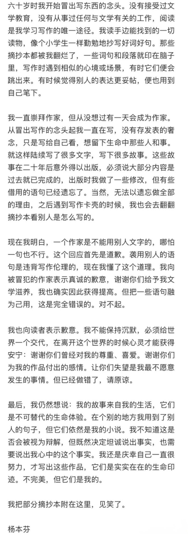 2月26日,杨本芬通过社交媒体发布长文道歉,承认自己在写作中“袭用别人的语句”,她解释自己并未受过专业的文学教育,早期通过阅读和抄写好词好句学习写作,有时候会无意识中将记忆融入自己的作品。