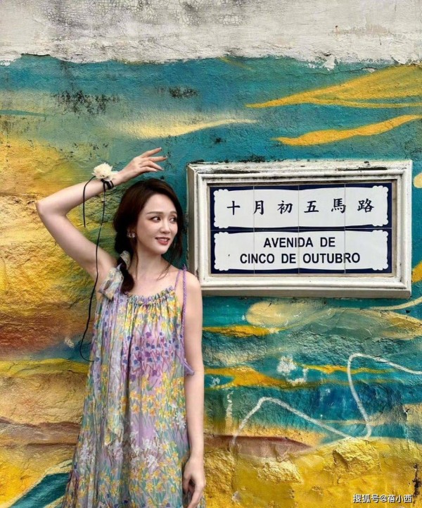 下面这一身搭配中,她更是把春日油画穿在了身上,一条印花吊带裙,浅紫、鹅黄、薄荷绿的晕染花纹像把花海穿在了身上,特别浪漫,轻薄的雪纺材质随风飘动,吊带和抽褶设计弱化了刻意感,显得随性又洒脱。
