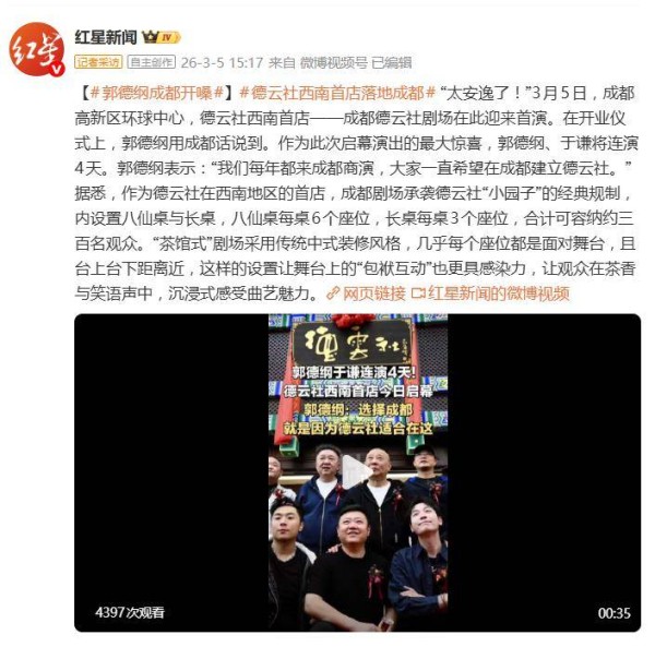 德云社西南首店落地成都高新!3月5日郭德纲于谦亮相首演郭德纲成都开嗓!德云社西南首店,成都德云社剧场今日首演