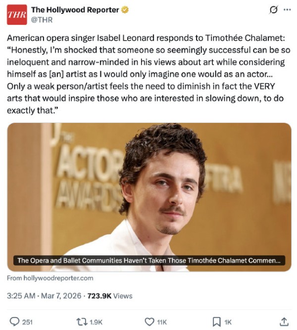 甜茶在外网被群嘲起因是他采访中说了一句“我不想在芭蕾舞团or歌剧院工作,那些大家嘴上说着要传承下去的艺术但其实根本无人在意”此言论目前已引爆外网,英国皇家歌剧院、纽约大都会歌剧院直接下场艾特本人开撕美国歌剧演唱家伊莎贝尔·莱昂纳德对此回应“说实话,我很震惊,一个看起来如此成功的人,在谈论艺术时竟会如此词不达意、眼界狭隘,还自诩为艺术家,这种自我认知大概只有演员才会有吧…只有内心脆弱的人或艺术家,才会觉得有必要贬低那些本应鼓励人们慢下来、去感受生活的艺术形式。”