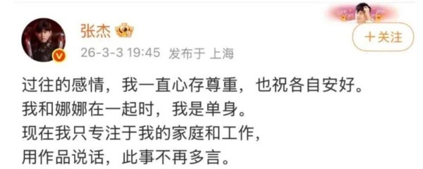 张杰的回应依旧克制:“我和娜娜在一起时是单身,以前的事不说了。”