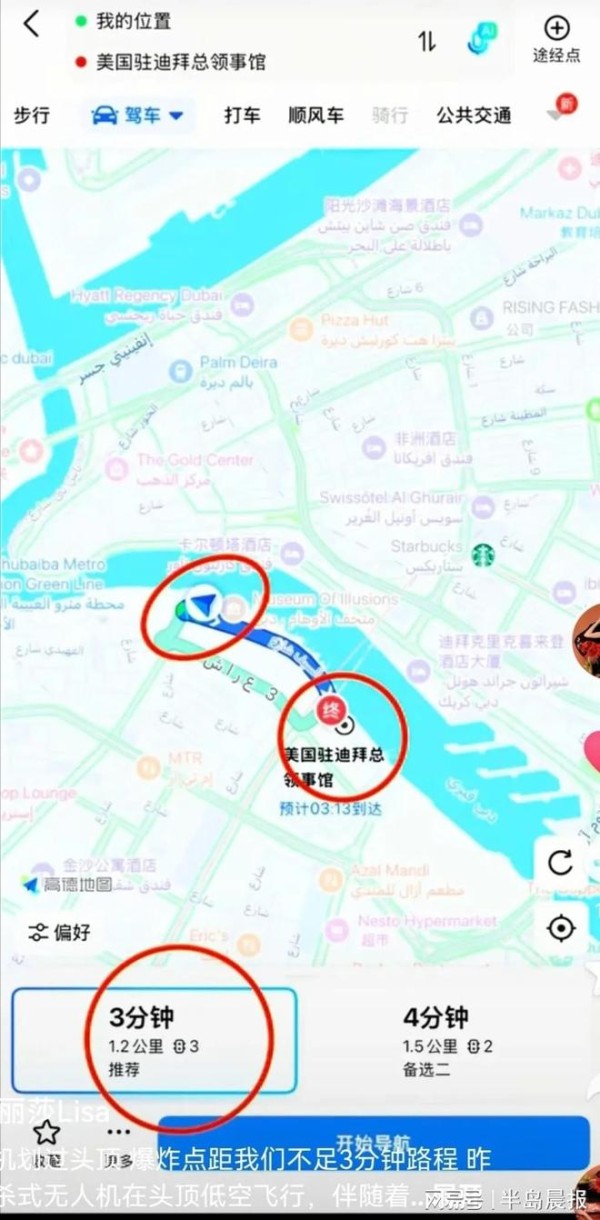 蒋丽莎还谈到,他们在迪拜经常吃汉堡薯条,不敢住高层酒店,怕有意外不好逃生,于是选择了五六百元一晚的二层酒店。不料美国领事馆附近发生爆炸,距离他们只有1.2公里,不足3分钟车程。