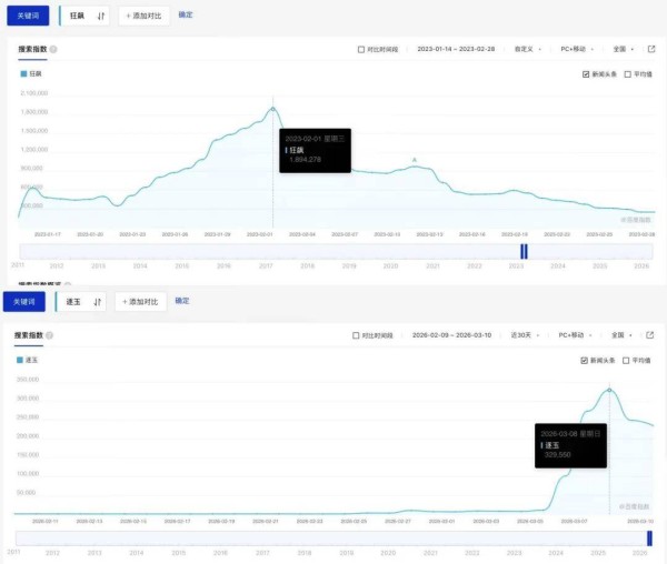 反观《逐玉》,其当前的讨论度和国民性,与它超越《狂飙》的播放量显然并不匹配。截至发稿,《逐玉》百度指数峰值仅32.9万,而《狂飙》开播第二天单日百度指数就已经冲破63万,峰值更是逼近190万。