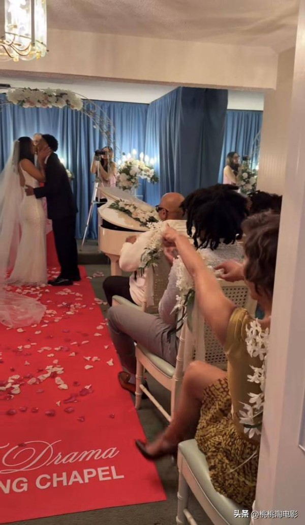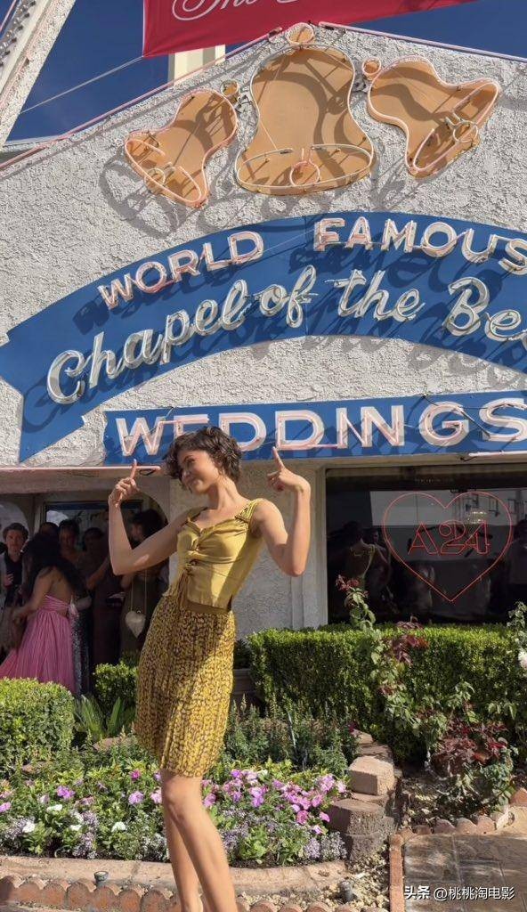 这场婚礼其实是制片公司A24为赞达亚新片《爱情抓马》策划的一场硬核宣发。他们在拉斯维加斯包下教堂,专门为情侣提供闪婚服务,赞达亚则是作为特别惊喜空降。