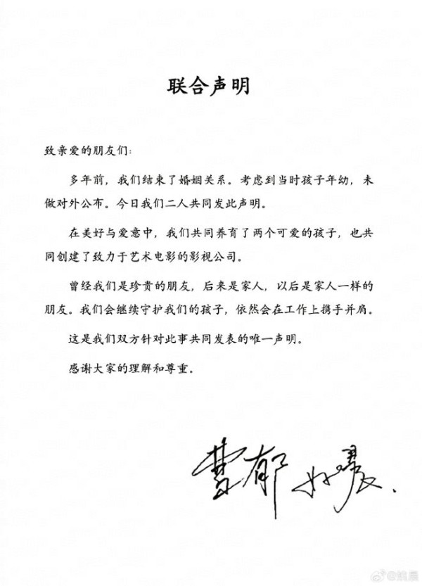 多年前,我们结束了婚姻关系。考虑到当时孩子年幼,未做对外公布。今日我们二人共同发此声明。