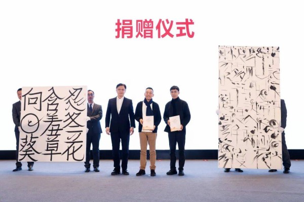 刘彦湖先生、卢俊舟先生向山东美术馆捐赠书法作品,杨晓刚馆长为艺术家颁发收藏证书。